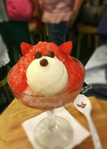 Boo strawberry pesanan saya datangnya cukup lama, lebih dari 15 menit. Tapi saat pesanan datang, saya malah tidak ingin memakannya karena penampilannya yang lucu. Boo strawberry adalah es serut yang dibentuk menyerupai muka beruang. Kakigori disiram dengan saus strawberry, diberi potongan strawberry sebagai telinga dan diberi es krim vanila sebagai wajah beruang lengkap dengan mata dan hidung dari biskuit coklat. Cute banget iiih.