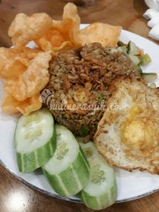 Nasi gorengnya freshly made by order, terlihat dari asap yang masih tampak mengepul ketika menu pesanan diantarkan ke meja, dengan taburan bawang goreng di atasnya, ditambah dengan telur ceplok (telur mata sapi), acar (terdiri dari potongan timun, wortel, bawang merah, cabai rawit), irisan timun, dan kerupuk. Penyajian nasi goreng dan kawan-kawannya ini membuat piring penyaji tampak penuh.